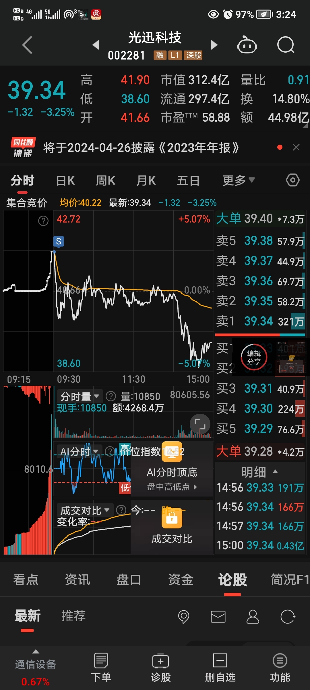 光迅科技收盘下跌390%,滚动市盈率4712倍,总市值34609亿元